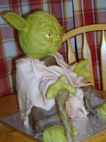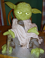 I am working on a Yoda cake for a Star Wars themed birthday party for my youngest son's best friend. Here is a quick pic. of the head "in progress". It is a bit freaky and well...creepy, without the eyes fully painted. Ha Ha Ha